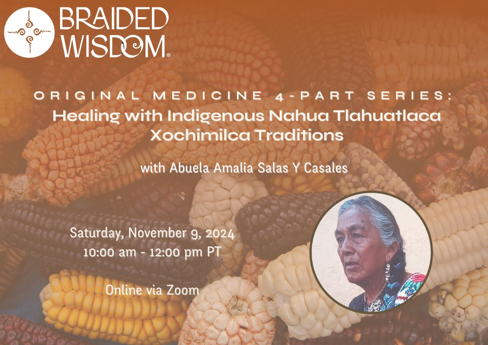 This program registration is for Original Medicine 4-Part Series: Healing with Indigenous Nahua Tlahuatlaca Xochimilca Traditions with Abuela Amalia Salas Y Casales on Saturday, November 9, 2024,10:00 am - 12:00 pm PST.
