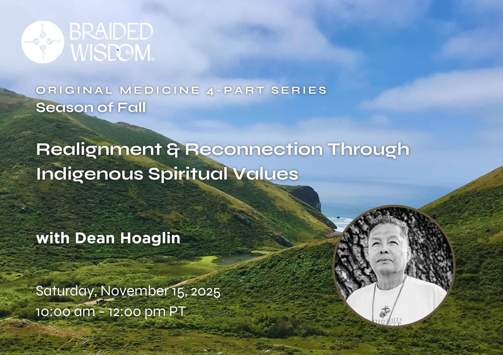 This program registration is for Original Medicine 4-Part Series: Realignment & Reconnection Through Indigenous Spiritual Values with Dean Hoaglin on Saturday, November 15, 2025, 10:00 am - 12:00 pm PST.