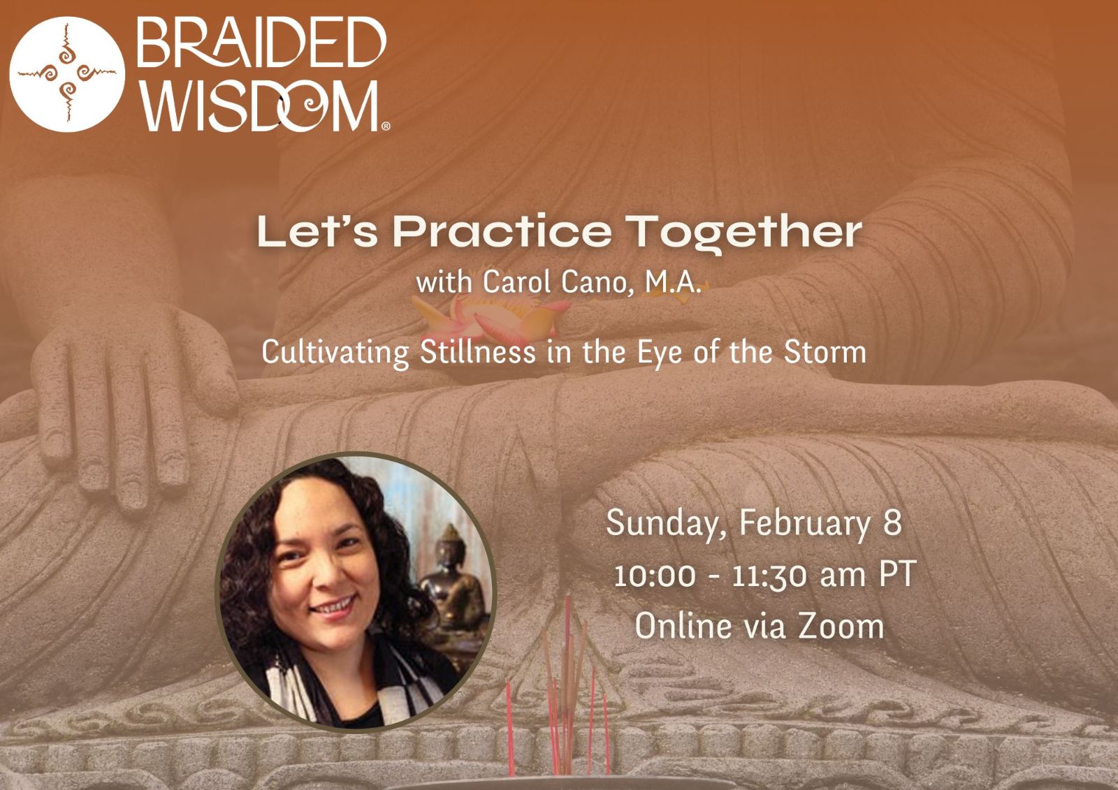 This program registration is for the Let's Practice Together: Cultivating Stillness in the Eye of the Storm with Carol Cano, Sunday, February 8, 2026 from 10:00 - 11:30 am (Pacific Time).