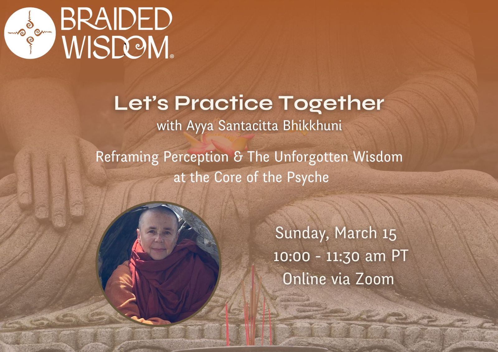This program registration is for the Let's Practice Together: Reframing Perception & The Unforgotten Wisdom at the Core of the Psyche with Ayya Santacitta Bhikkhuni, Sunday, March 15, 2026 from 10:00 - 11:30 am (Pacific Time).