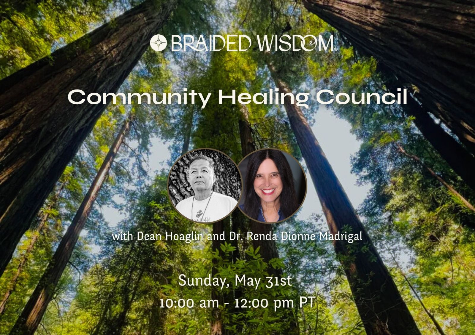 This program registration is for the Community Healing Council with Dean Hoaglin & Dr. Renda Dionne Madrigal, Sunday, May 31, 2026 from 10:00 am - 12:00 pm PT (Pacific Time).